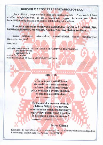 Szeretettel várjuk magyar nemzettestvéreinket 2007. június 4-én, hétfőn, 18 órára a Királyhágómelléki Református Egyházkerület Székházának Dísztermébe (Városháza u. 27. sz.).