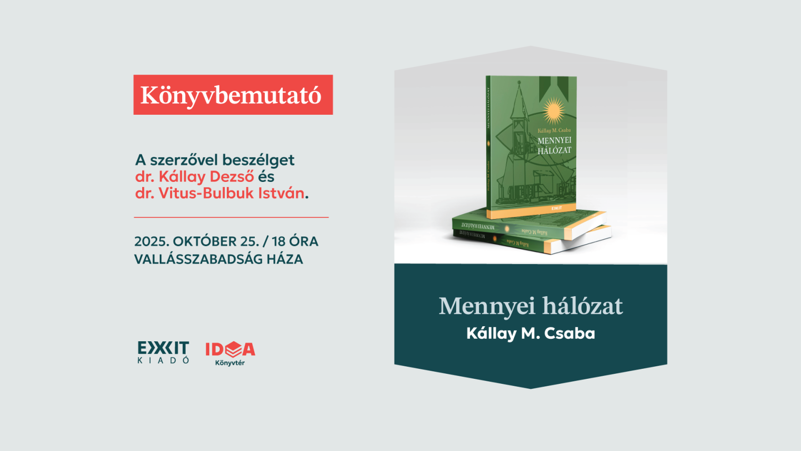 Könyvbemutatót tartanak október 22-én 18 órától a Vallásszabadság Házában, ahol Kállay M. Csaba Mennyei hálózat című könyvét ismerhetik meg az érdeklődők. A szerzővel dr. Kállay Dezső, a Protestáns Teológiai Intézet adjunktusa, valamint dr. Vitus-Bulbuk István, az Ajtoni Református Egyházközség lelkipásztora beszélget majd a könyvről.