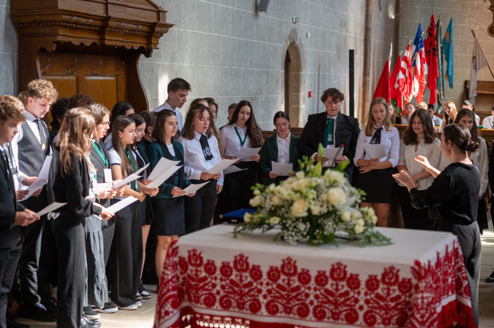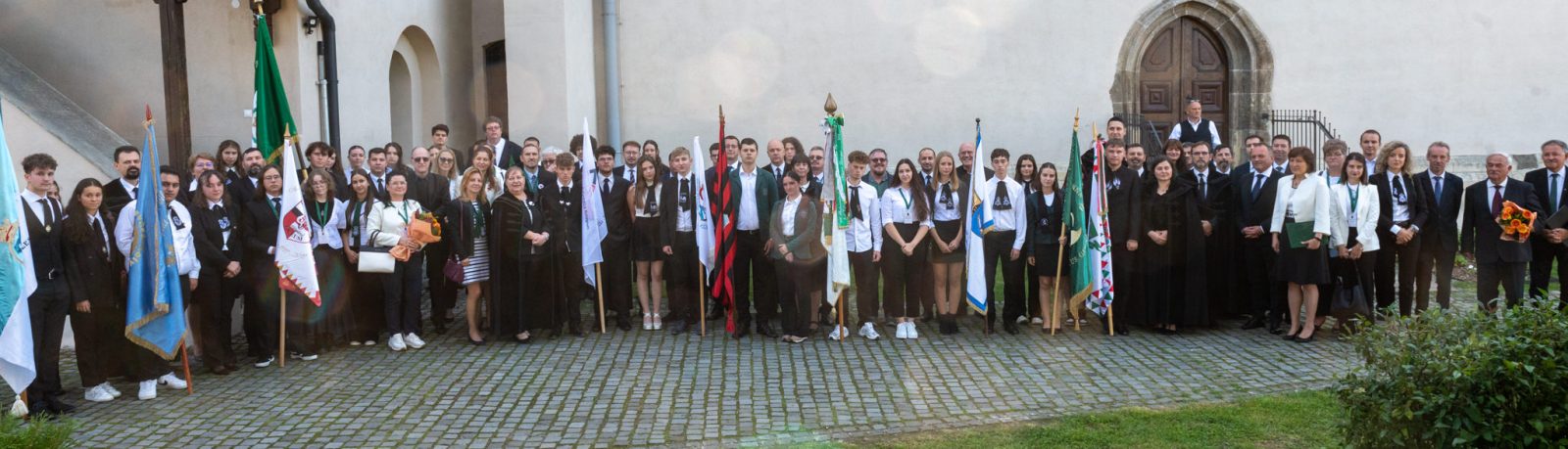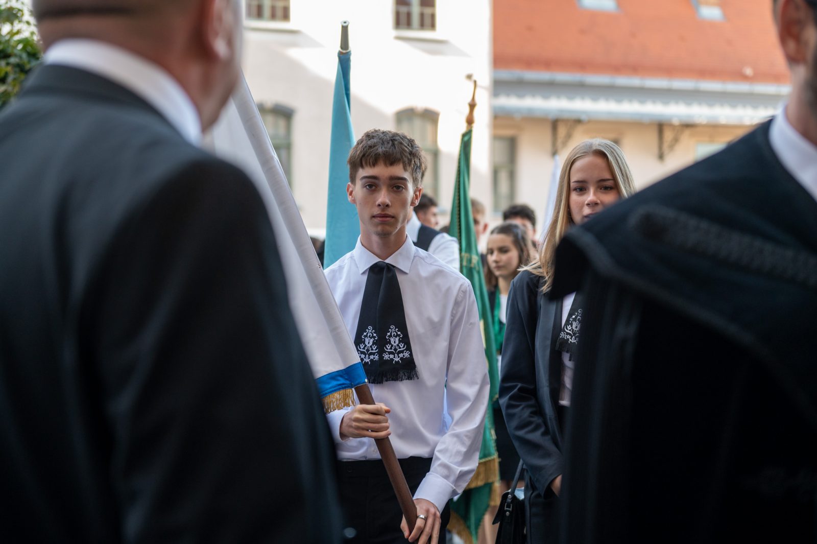 Az iskolákat képviselő diákok a tanintézmények zászlóival vonultak át a Bolyai Farkas Elméleti Líceum udvaráról a tanévnyitónak helyet adó Vártemplomba. 📸 Kiss Gábor