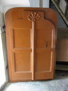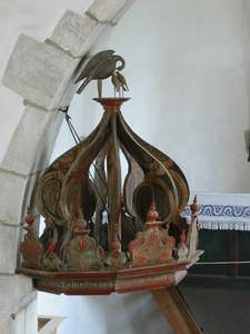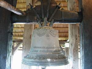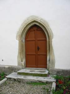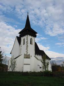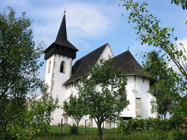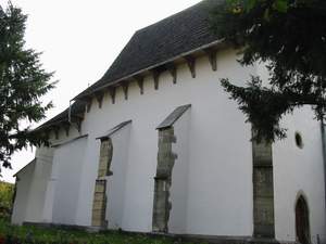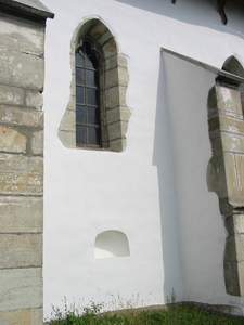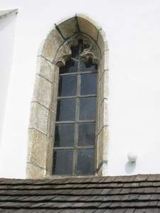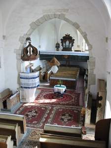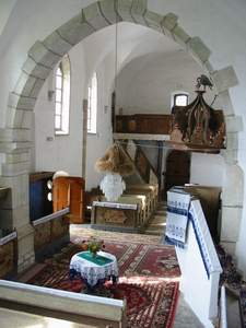 A hajó szemöldökgyámos ajtaja is délről vezet be. A vállköves csúcsos diadalív főlőtt felért, valaminő későbbi javítást örökít meg. A toronynisokat 1716-ban építették, és mind a torony mind a templom zsindellyel van befedve. | ||